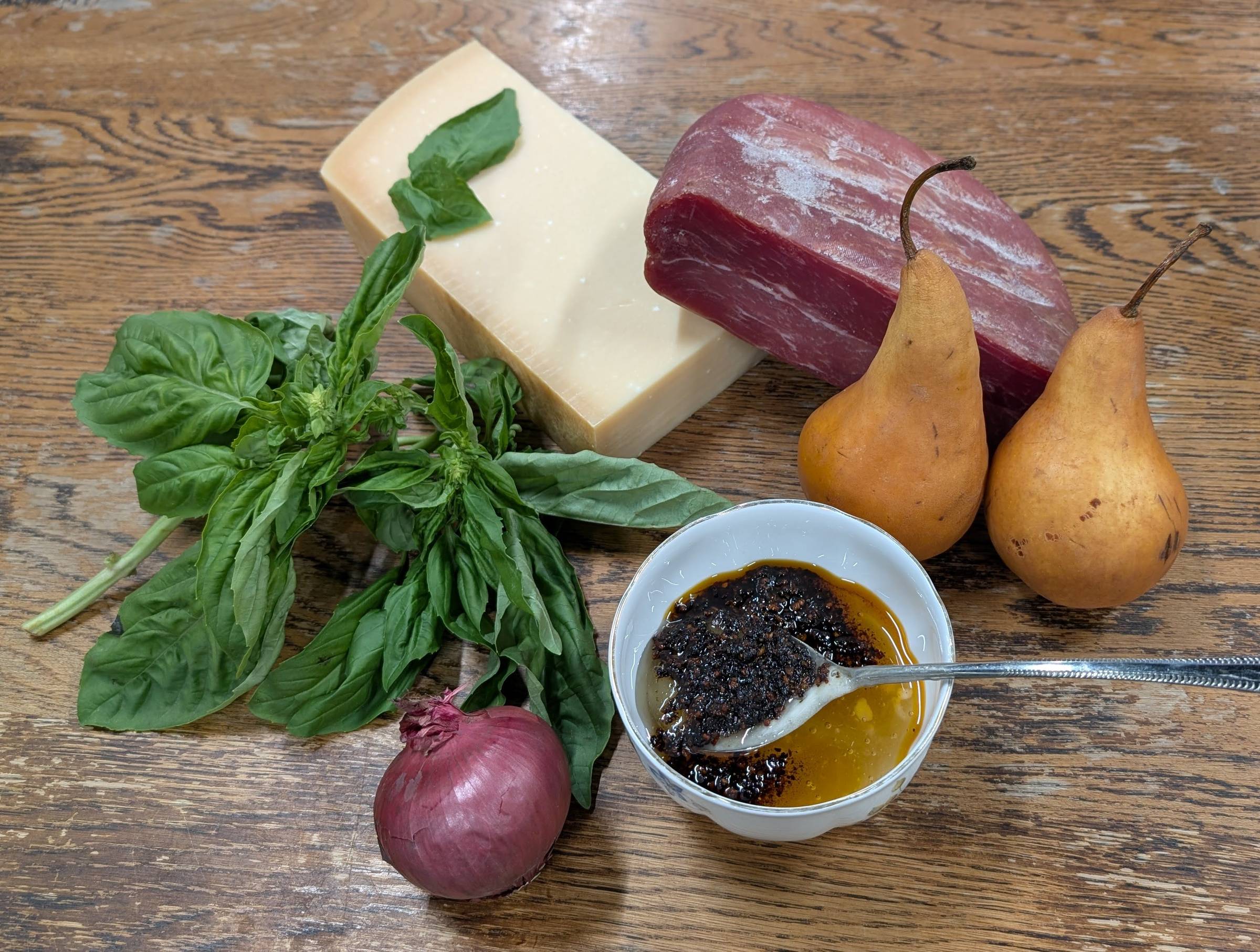 We’re starting with a creamy base of queso and cream, then layering on roasted pears, ribbons of prosciutto, a touch of red onion for balance, fresh basil, and of course, loads of mozzarella to bring it all together.